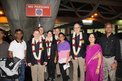 wir möchten uns nun bei euch in regelmäßigen Abständen melden, um euch unsere Eindrücke sowie unser Leben hier in Chennai etwas näher zu beschreiben. Wir starteten am Samstag, 18.01.2013 um 05.55 Uhr ab Leipzig Richtung Frankfurt. Mit sehr großer Verwunderung mussten wir in Frankfurt feststellen, dass unser Anschlussflug nach Chennai vollkommen überbucht war und man uns bat, doch später zu fliegen. Dies haben wir natürlich nicht getan, denn unsere indischen rotarischen Freunde warteten auf uns. Nach unendlichen 10 Stunden kamen wir bei rund 26 Grad Außentemperatur gg. 24 Uhr in Chennai an und wurden von einer Delegation in Empfang genommen. Es war ein sehr warmherzlicher Empfang und wir hielten diesen Augenblick für euch bildlich fest. Unser Freund Sri, ebenso der Koordinator des gesamten GSE-Austausches, brachte uns anschließend ins Hotel, wo wir die erste Nacht untergebracht waren. Mit diesen ersten umwerfenden Impressionen haben wir den Tag/Nacht ausklingen lassen. Eure Marion, Torsten, Andreas und Rayk ... link